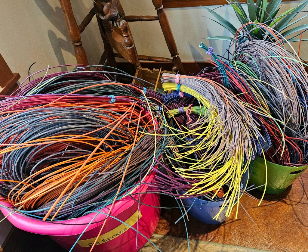 Reggie’s home is set up for an intimate class. Coils of colorful reeds are carefully arranged near the front door across from all of the Whidbey Island artist brochures. There is a small circle of five chairs for her students, bowls of hot water, plyers, and clothes pins… all necessary items for basket weaving.