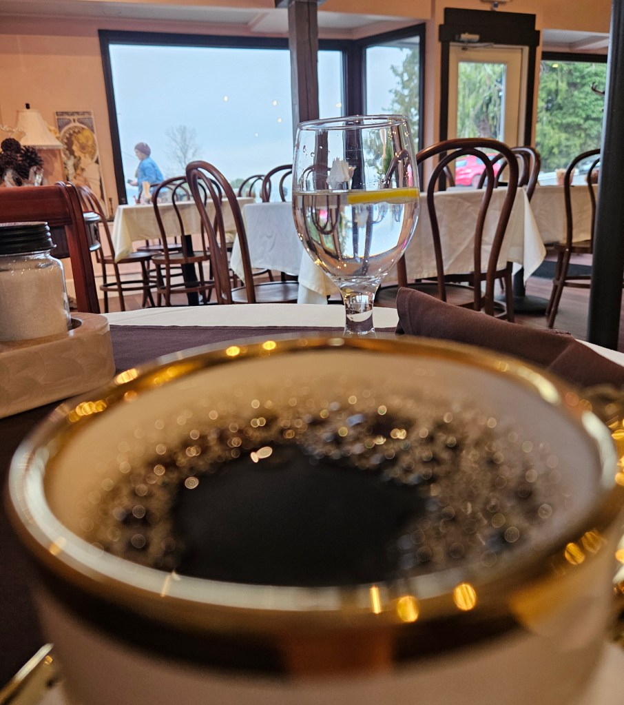 Even in transition, the space felt warm on that gray February morning near the waterfront. I settled into a small table by the window. Across from me hung an Alphonse Mucha print, a subtle nod to the region’s artistic heritage. My coffee arrived in a delicate gold rimmed mug. That detail alone felt like a quiet commitment to atmosphere.