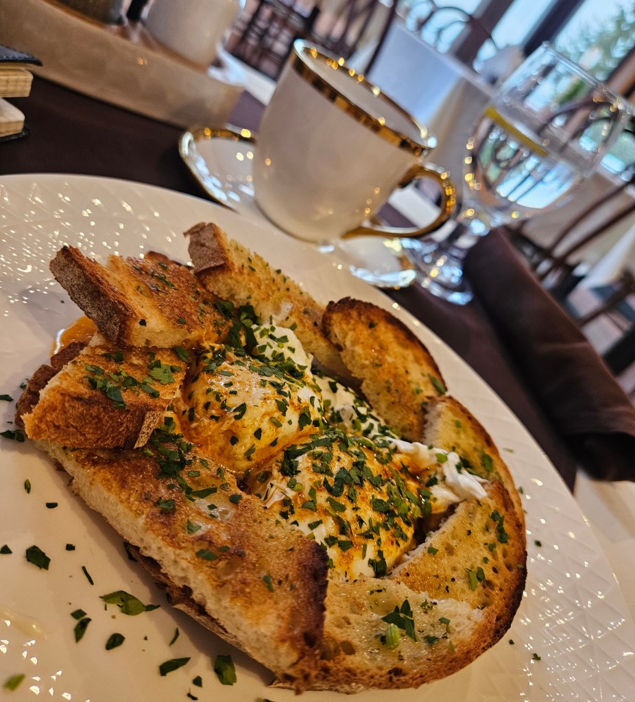 I had intended to order a kolache, but only strudels remained behind the glass case. Instead, I ventured into unfamiliar territory and ordered the Turkish eggs. What arrived was one of the most visually satisfying plates I have encountered in recent memory. Not oversized. Not excessive. Just enough. Two poached eggs rested in a bed of garlic herb yogurt, surrounded by wedges of lightly toasted crusty bread arranged like a savory wreath. When I pierced the first egg, the yolk spilled into the yogurt in a golden cascade. The toast quickly became a sponge for the sauce. It felt balanced. Intentional. Possibly one of the more authentic dishes on the menu.